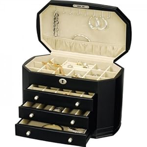 Keep your most valuable treasures safe and secure in the gorgeous Classic Jewelry Box. This jewelry storage box has an attractive appearance and convenient features that make it ideal for everyday use. The frame of this jewelry case is made from solid wood. Some of the features of this jewelry box include a top shelf with three ring rolls and 14 storage compartments, a lid with necklace hooks and a shirred storage pocket, and three removable drawers. The drawer pulls and lock are made from metal with an attractive silver finish that creates an excellent contrast to the wood box. Includes a key with a tassel. Assembly level/degree of difficulty: No Assembly Required.