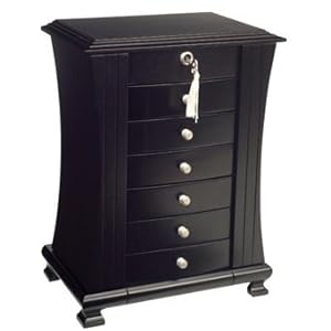 Modern yet elegant, this large contemporary jewelry box with lock and key, necklace sides and generous storage stands 14 1/2" tall.Crafted with the clean streamlined look contemporary furnishings and finished in a rich espresso.A favorite for several years running, this jewelry box features style and storage, at a great price!