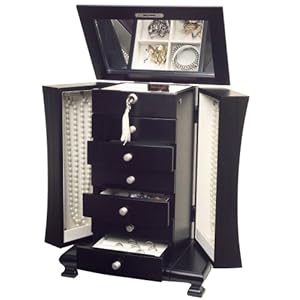 The Layla jewelry box is designed for the modern era with the clean, streamlined look of contemporary furnishings. Lift lid to find a mirror and two large divided sections plus six equal sections. Dividers in drawers keep things neat and tidy. Three necklace hooks in each side door. A tassel key lock keeps things secure. Hand-lined with ivory sueded fabric.