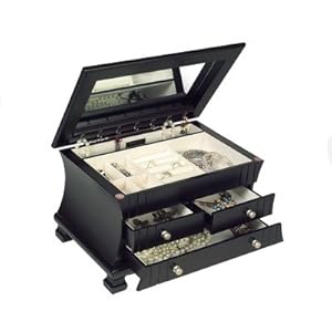 The lift lid on this java-finished jewelry box holds a full mirror on the inside. There is a hidden necklace drop, one large open drawer, two small open drawers, four small compartments, ring rolls, and one large open compartment. Interior is hand-lined with sand sueded fabric.