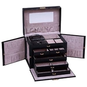 Elegance par excellence. Hand-crafted of the finest sleekest black leather, innovative in design, delicious tone, this jewelry box features convenient compartments, unique fold out panel design for hanging necklaces and bracelets, adorable mini travel case, gleaming gold-plated clasps, and large capacity to hold even the largest jewelry collections, Showcase your collection in glamour and style in this timeless jewelry case.